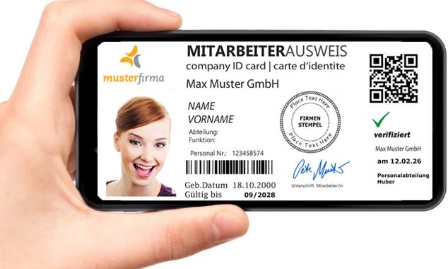Ihre Mitarbeiter können den verifizierten Ausweis sofort auf das Handy laden oder als Scheckkarte bestellen.
